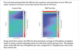 Professional Growers Services, LLC independent test using Sentek Drill and Drop soil moisture probes comparing DRI vs open drip emitters in the same vineyard location. In this test, Deep Root Irrigation achieved 50% soil saturation in half the time using 61.5% less water.
